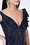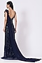 Featuring a navy blue gown in italian tulle base with beads, opaque crystals, and 3D floral hand embroidery, including a shoulder drape.