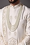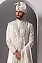 Featuring an ivory sherwani in raw silk base with hand embroidery. It is paired with a kurta, churidar pants, a safa, a stole and juttis. Perfect wear for weddings.