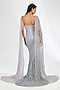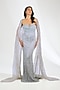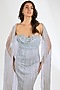 Featuring a blue corset gown in italian tulle base with beads and crystal hand embellishment, including cowl draped wing sleeves. Accentuate it with statement earrings and stilettos, perfect for a red carpet event, reception or formal evening gala.