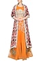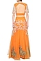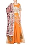 This set features an orange flared lehenga, set in net base. It is appliqued with pearl and gota patti embroidery in floral motifs on the centre front. It is paired with a matching orange blouse festooned with pearl embroidery in an ornate floral pattern on the bodice and floral printed dupatta, accented with pearl embroidered border along the edges.