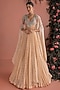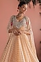 Bhumika Sharma presents a beige blouse in georgette base with floral embroidery with a skirt and a cape. Accentuate it with zircon jewellery and metallic heels for a stylish ensemble, ideal for weddings, engagement or sangeet celebrations.