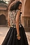 Bhumika Sharma features a black skirt in organza base with floral print. It is paired with an embroidered bow blouse and a jacket having bold ambi embroidery. Style this designer set with chandbalis, soft waves, and strappy heels for a graceful ensemble. perfect for sangeet nights, receptions, and wedding celebrations.