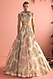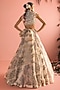 Bhumika Sharma presents a champagne lehenga in organza base. It is paired with an embroidered blouse having bow detailing. Accentuate it with zircon jewellery and metallic heels for a stylish ensemble, ideal for weddings, engagement or sangeet celebrations.