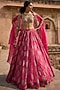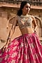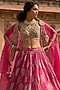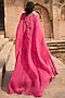 Bhumika Sharma features a fuchsia cape in organza base with embroidery. It is paired with a printed lehenga and a blouse. Style this designer set with chandbalis, soft waves, and strappy heels for a graceful ensemble. perfect for sangeet nights, receptions, and wedding celebrations.