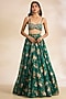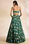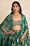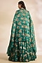 Featuring a green cape in organza and net base with print. It is paired with an embroidered bustier and a skirt. Style it with zircon stud earrings, a clutch bag and metallic heels for a cocktail, sangeet, mehendi or wedding ceremony.