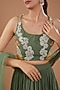 Featuring a green lehenga in silk base. It is paired with an embroidered blouse and a dupatta. Accessorize it with dangler earrings and heels for an engagement or a mehendi ceremony.