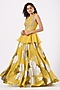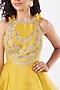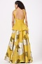 Featuring a light mustard peplum top in organza base with zardosi, tilla, sequins, and mirror embroidery. It is paired with a matching dahlia printed skirt.