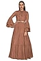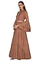 Featuring a nude ruffled gown in chiffon base with print. It has an embroidered belt and shantoon underlining.