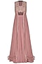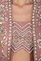 Featuring a pink bustier top in georgette base with geometric pattern hand embroidery. It is paired with a matching skirt and cape.