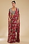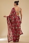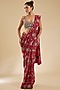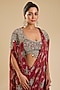 Featuring a red draped saree in georgette and net base with print. It is paired with an embroidered blouse and a cape. Accentuate it with statement earrings, embellished juttis and a sleek clutch for an elegant look, perfect for festive celebrations, sangeet or cocktail ceremonies.
