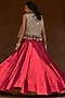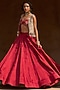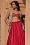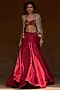 Bhumika Sharma features a red skirt in linen satin and net base. It is paired with an embroidered bustier and a jacket. Style this designer set with chandbalis, soft waves, and strappy heels for a graceful ensemble. perfect for sangeet nights, receptions, and wedding celebrations.