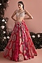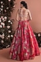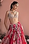 Bhumika Sharma presents a red lehenga in organza base with print. It is paired with a bustier and a printed dupatta. Accentuate it with zircon jewellery and metallic heels for a stylish ensemble, ideal for weddings, engagement or sangeet celebrations.