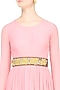 Featuring a tan thin belt in leather base embedded with pearl, cutdaana and dori embroidery in an ornate rosette pattern.