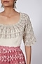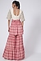 Featuring white and red sharara pants in georgette base with moroccan print. It is paired with a matching peplum top having pearls, sequins, and kasab embroidery, a net frilled dupatta, and a fabric belt.