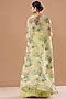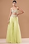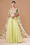 Featuring a mint and blue lehenga in organza base. It is paired with a matching embroidered blouse and cape having print.