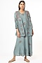 Featuring a dusty blue flared dress in organic silk base with beads, resham, thread, sequins and floral hand embroidery. It is paired with a matching open jacket.