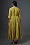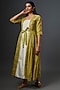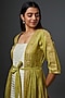 Featuring a lime green shrug in organza silk base with gota patti, beads, cutdana, zardosi, and kasab embellishments, including an attached belt. It is paired with a contrasting off-white striped inner dress.
