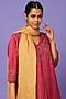 Featuring a raspberry red front slit kurta in organic silk base with resham, aari and zardosi hand embellishments. It is paired with contrasting mustard stole and a mask.