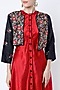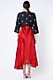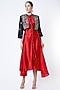 Featuring a cadmium red asymmetric kurta in organic silk base. It is paired with a contrasting black hand embroidered short jacket with zardosi, thread, bead and sequins embroidery.