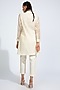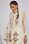Featuring a white shirt in organic cotton silk base with resham, floral motifs, sequins, zardosi, and cutdana hand embroidery. It is paired with matching cigar pants and a stole.