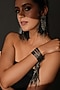 Featuring a gunmetal finish dangling bracelet with black shimmering crystals and metal chains, set in brass. Perfect for cocktail hours, parties, and glamorous nights out, this jewellery is a wardrobe must for those who love to shine effortlessly.