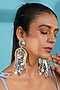 Featuring a pair of silver finish dangler earrings studded with mirror work, sequins and crystals, set in brass. Perfect for cocktail hours, parties, and glamorous nights out, this jewellery is a wardrobe must for those who love to shine effortlessly.