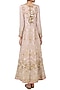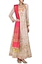 Featuring a pastel lavender anarkali gown in georgette base with zardozi, resham and french knots hand embroidery all over, with hand crafted elephant motifs. It is paired with a contrast fuchsia pink banarasi dupatta.