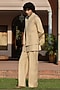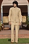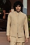 Featuring a beige bundi jacket in suiting base. It is paired with a kurta and pants. Style it with mojaris for a wedding, engagement or sangeet ceremony.