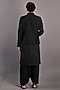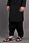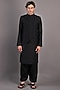 Featuring a black nehru jacket in dupion silk base with abstract embroidery. It is paired with a matching cotton satin kurta and salwar pants. Perfect wear for festive occasions or wedding ceremonies.