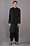 Featuring a black nehru jacket in textured fabric base. It is paired with a matching cotton satin kurta and salwar pants. Perfect wear for festive occasions or wedding ceremonies.