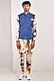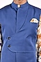 Featuring a blue overlapped bundi jacket in modal base, including a pocket square. It is paired with a contrasting printed kurta and pants. Perfect wear for a festive occasion, pooja or engagement ceremony.