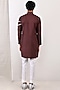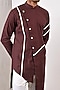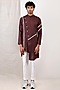 Featuring a dark mahogany asymmetrical kurta in linen base with contrasting panels. It is paired with contrasting off-white pants.