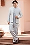 Featuring a grey indowestern jacket in chikankari base. It is paired with a terry wool kurta and pants. Style it with mojaris for a festive occasion, reception, wedding, sangeet or engagement ceremony, exuding traditional charm and elegance.