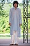 Featuring a light blue kurta in chikankari base. It is paired with off-white tussar salwar pants and a georgette dupatta. Style it with mojaris for a festive occasion, wedding, sangeet or engagement ceremony, exuding traditional charm and elegance.