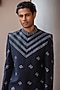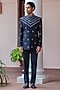 Featuring a navy blue bandhgala in wool suiting base. It is paired with pants. Style it with shoes for a festive occasion, reception, sangeet or engagement ceremony.