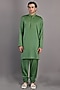 Featuring an off-white sherwani in terry wool base with hand embroidery. It is paired with a matching modal kurta, leaf green churidar pants, a chanderi dushala, and a pair of terry wool loafers.