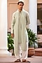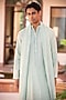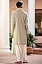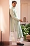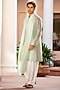 Featuring a sage green kurta in chikankari base. It is paired with off-white tussar salwar pants and a georgette dupatta. Style it with mojaris for a festive occasion, mehendi, wedding, sangeet or engagement ceremony, exuding traditional charm and elegance.