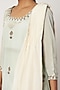 Featuring a mint green top in cotton moss base with block print. It is paired with off white pants and an attached dupatta.