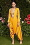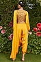 Featuring a mustard pre-draped saree in satin chiffon base with an attached dupatta. It is paired with a matching hand-embroidered blouse having embroidered sleeves.