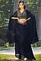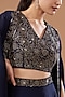Featuring a navy blue cape in satin chiffon base with hand embroidery. It is paired with a matching embroidered top and a draped skirt.