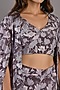 Featuring a purple crop top in crepe base with digital print and embroidery. It is paired with matching sharara pants and a cape.