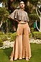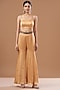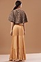 Featuring a rose gold cape in satin chiffon base with hand-embroidered motifs. It is paired with a matching top and flared sharara pants.