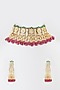 Featuring a 22 Kt micro gold plated necklace studded with kundan polki, semi-precious red and green beads, set in mixed metal. It is paired with a matching pair of earrings.