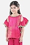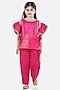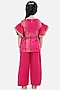 Featuring a pink top in silk base with ruffle sleeves. It is paired with matching pants.