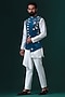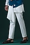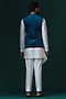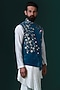 Featuring a teal blue asymmetric nehru jacket in micro velvet base with floral embroidery. It is paired with an off-white draped kurta and trousers. Perfect wear for festive occasions.