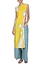 Featuring a yellow cut work tunic in cotton kattan base. It is paired with light blue pants with a side square pocket.