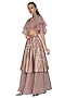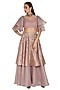 Featuring a blush pink crop top in poly organza base with flared sleeves, dabka work, sequins and zardosi embroidery. It is paired with matching tiered skirt in brocade chanderi and organza base.
