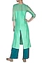 Featuring a red side and front slit kurta in chanderi silk and cotton base with applique and thread hand embroidery. It is paired with envelope pants and cape in silk base.