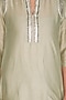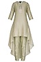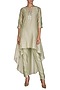 Featuring a sage green tunic in silk chanderi and shantoon base with silver dabka and silk thread embroidery. It is paired with matching cigarette pants.