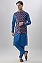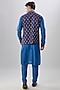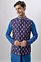 Featuring a blue bundi jacket in chiniya silk base with ikat print and kasab embroidery. Style it up with a kurta set and mojaris for a festive occasion or pooja ceremony, exuding charm and elegance.